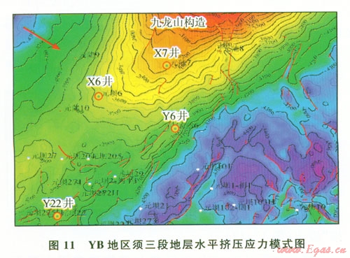 YB構(gòu)造位于四川盆地北部,地處龍門(mén)山前、米倉(cāng)山前、大巴山前推覆褶皺帶交合處,具有三重構(gòu)造應(yīng)力擠壓背景。元陸7井附近地層屬于九龍山構(gòu)造西南翼斜坡帶,其構(gòu)造應(yīng)力主要來(lái)源于龍門(mén)山南東向的水平構(gòu)造擠壓應(yīng)力以及大巴山縱向擠壓造成的膏鹽巖“上拱”應(yīng)力(圖11、12)。