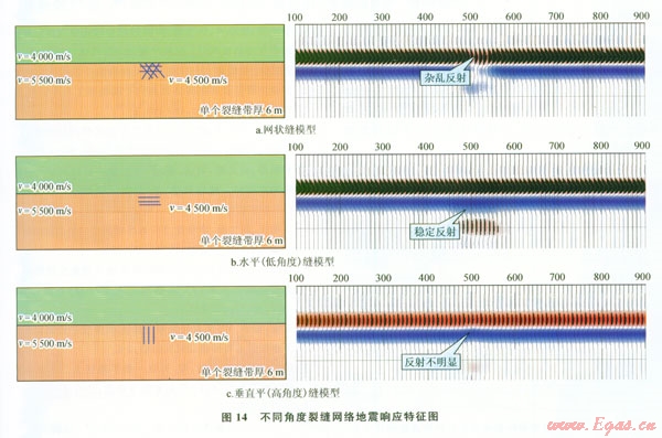 通過(guò)不同類(lèi)型裂縫網(wǎng)絡(luò)模型正演(圖14):網(wǎng)狀裂縫具有典型的雜亂反射特征,而近水平裂縫表現(xiàn)為穩(wěn)定強(qiáng)反射特征,高角度垂直縫沒(méi)有明顯地震響應(yīng)。因此,利用“雜亂反射”屬性進(jìn)行須三段裂縫預(yù)測(cè)。