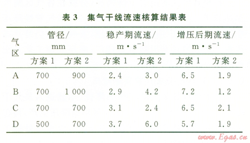 在增壓方案比選中,一般考慮集氣干線管徑、流速和壓縮機(jī)功率等因素。