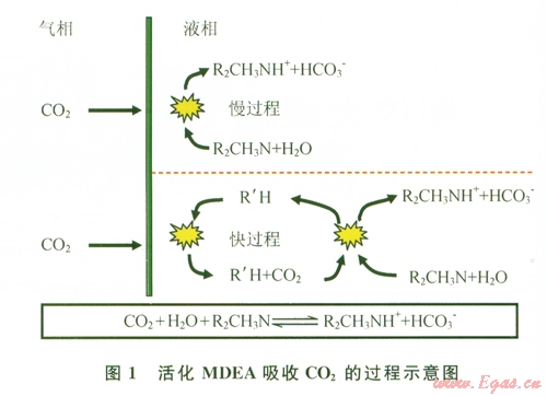 從式(1)、(5)、(6)可知,R'H只是起傳遞C02的作用,是循環(huán)使用的。加入活化劑R'H后式(5)的反應相比式(2)的反應要快得多,活化劑加快了反應速度,減少了反應時間,提高了MDEA溶液吸收C02的能力(圖1),降低了整個裝置循環(huán)量和填料高度,減少了裝置投資并具有節(jié)能效果。