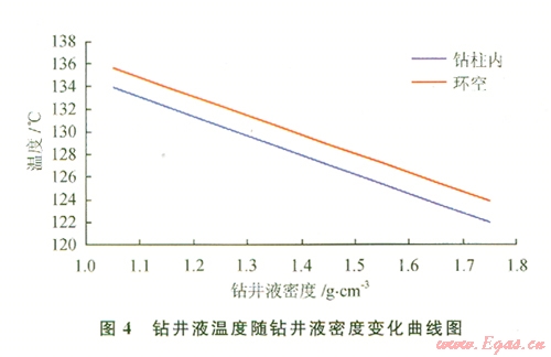 圖4反映了鉆柱內(nèi)和環(huán)空鉆井液溫度隨鉆井液密度的變化規(guī)律。