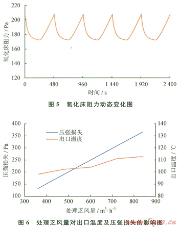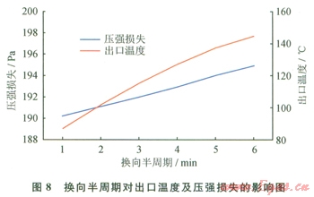 圖8描述的是換向半周期與氧化床壓強損失及出口溫度之間的關(guān)系(乏風(fēng)量為