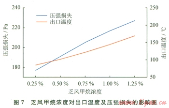 圖7給出了氧化床壓強損失和出口溫度隨進口乏風(fēng)甲烷濃度的變化圖,模擬時保持上述模擬換向半周期(2 min)不變,將乏風(fēng)量設(shè)置為