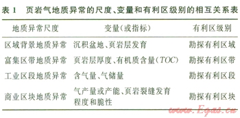地質(zhì)異常找礦理論和方法是基于對“致礦地質(zhì)異常”的深入研究,對包括非傳統(tǒng)礦產(chǎn)資源在內(nèi)的各類礦產(chǎn)資源進(jìn)行預(yù)測的有效理論和方法[l8],其在非傳統(tǒng)金屬礦床的勘探中已經(jīng)取得了很大成功[19-22]。對于頁巖氣這種非傳統(tǒng)油氣資源,地質(zhì)異常找礦理論與方法也具有廣闊的應(yīng)用前景。筆者基于頁巖氣地質(zhì)異常理論框架研究成果,根據(jù)頁巖氣的特殊地質(zhì)條件,將頁巖氣藏的地質(zhì)異常序列區(qū)分為區(qū)域背景地質(zhì)異常、富集區(qū)帶地質(zhì)異常、潛在工業(yè)區(qū)段地質(zhì)異常和商業(yè)區(qū)塊地質(zhì)異常4個(gè)層次:①區(qū)域背景地質(zhì)異常主要指標(biāo)包括沉積盆地和頁巖發(fā)育;②頁巖氣富集區(qū)帶地質(zhì)異常主要指標(biāo)包括頁巖厚度和總有機(jī)碳含量(TOC);③頁巖氣潛在工業(yè)區(qū)段地質(zhì)異常的主要指標(biāo)包括氣含量和氣儲量;④頁巖氣商業(yè)區(qū)塊地質(zhì)異常的主要指標(biāo)包括頁巖氣產(chǎn)量、產(chǎn)能、頁巖的裂縫發(fā)育程度和脆性。這4個(gè)層次的異常分別是頁巖氣勘探有利區(qū)域、頁巖氣勘探有利區(qū)帶、頁巖氣勘探有利區(qū)段和頁巖氣有利區(qū)塊等4個(gè)不同有利級別預(yù)測區(qū)圈定的依據(jù)。頁巖氣地質(zhì)異常的尺度、變量、有利區(qū)級別的相互關(guān)系可概括為表l。