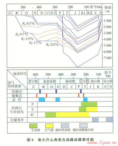 結(jié)合南大巴山的構(gòu)造發(fā)育史,該區(qū)油氣藏成藏過程可以分為3個階段:晚三疊世—早侏羅世開始變形,形成寬緩背斜,形成古油藏;中侏羅世—早白堊世進(jìn)一步變形,圈閉構(gòu)造定型,部分古油藏裂解,形成油氣藏;古近紀(jì)喜山運(yùn)動對先期構(gòu)造進(jìn)行了強(qiáng)烈的改造,造成古油氣藏的調(diào)整與破壞。