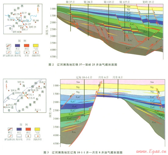 2)灘海西部地區(qū)油氣分布層間差異大,油氣藏類型變化快,油氣藏主要沿砂體和斷裂分布;中部地區(qū)油氣主要分布在斷裂發(fā)育且封蓋條件較好的層位,油氣性質(zhì)差異明顯;東部地區(qū)以發(fā)育氣藏為主,平面上分布穩(wěn)定,具有油氣分布井段長、砂體延伸范圍小、相變快的特點(diǎn),不同斷塊、不同組段油氣發(fā)育程度差異大,并以中淺部層系多套氣藏疊置發(fā)育為主。