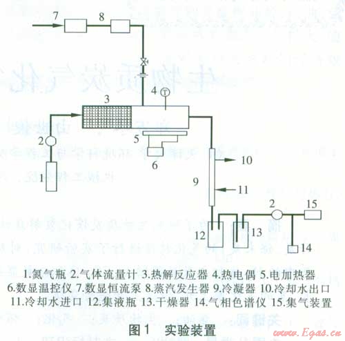 實(shí)驗(yàn)裝置見圖l,該系統(tǒng)包括熱解反應(yīng)器、蒸汽發(fā)生器、熱解氣冷卻裝置、檢測系統(tǒng)等。熱解反應(yīng)器為長450 mm、內(nèi)直徑為70 mm的不銹鋼圓柱體。熱解反應(yīng)器左端長200 mm的區(qū)域?yàn)椴牧洗娣艆^(qū),右端長200 mm的區(qū)域?yàn)樯镔|(zhì)熱解區(qū),50 mm長的中間問隔是為了減輕材料的預(yù)熱解。生物質(zhì)熱解區(qū)由獨(dú)立的電加熱器加熱,加熱功率為1.5 kW,溫度由K型熱電偶測量,并由數(shù)顯溫控儀進(jìn)行控制。熱解反應(yīng)器后接1個(gè)長度為300 mm的冷凝器,用以分離可凝結(jié)相和氣體。實(shí)驗(yàn)裝置設(shè)置保溫層,氣體管道采用電加熱的方式保溫,溫度設(shè)定為300℃,主要是為了防止可凝結(jié)相凝結(jié)。水由數(shù)顯恒流泵送入蒸汽發(fā)生器,蒸汽由生物質(zhì)熱解區(qū)最左端加入,其溫度由一個(gè)E型熱電偶測量,并由溫控器控制。