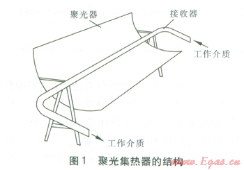 槽式太陽(yáng)能發(fā)電系統(tǒng)將多個(gè)槽型拋物面聚光集熱器經(jīng)過串并聯(lián)的排列,收集較高溫度的熱能,加熱工作介質(zhì),產(chǎn)生蒸汽,驅(qū)動(dòng)汽輪發(fā)電機(jī)組發(fā)電。系統(tǒng)包括:聚光集熱器(由聚光器、接收器組成)、換熱系統(tǒng)、工作介質(zhì)循環(huán)動(dòng)力設(shè)備、汽輪發(fā)電機(jī)等。聚光集熱器的結(jié)構(gòu)見圖1。聚光器采用拋物面形,將太陽(yáng)光反射匯聚到接收器上。接收器由表面鍍有太陽(yáng)選擇性膜層的鋼管(內(nèi)管)及玻璃外套管組成,二者之間的空間為真空,以減少傳熱損失。