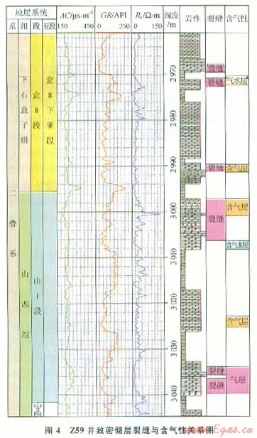低滲透砂巖油氣藏滲流起主導(dǎo)作用的為宏觀裂縫系統(tǒng),而微觀裂縫主要是改善儲層的滲透性能。裂縫是低滲透砂巖儲層的主要滲流通道,控制了油氣藏的滲流系統(tǒng)[6]。研究區(qū)占主導(dǎo)地位的是構(gòu)造裂縫,裂縫是極好的運移通道,是溝通孔洞、形成優(yōu)質(zhì)儲層的重要因素,對天然氣聚集成藏的重要影響。在裂縫較為發(fā)育的地區(qū)或?qū)佣?,尤其是對低孔、低滲的砂巖儲層而言,裂縫發(fā)育的層段,砂巖含氣性明顯好于一般的砂巖儲層,氣層、含氣層基本對應(yīng)于裂縫發(fā)育井段(圖4)。表明裂縫對儲層物性具有明顯的改善作用,是形成高產(chǎn)氣藏的重要條件。