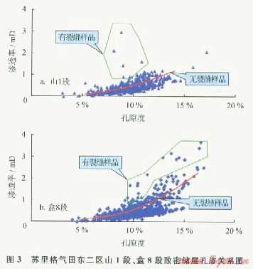 裂縫所形成的孔隙度占巖石體積的1%~2%,雖然構(gòu)成的儲集空間很小,對孔隙度的影響不大,但由于裂縫的存在,連通了孤立狀存在的孔隙,形成了砂巖的滲濾通道,提高了巖石的滲透率,對儲層的物性有明顯的改善作用。一般無裂縫發(fā)育的樣品,其孔隙度與滲透率呈現(xiàn)較好的線性正相關(guān)關(guān)系;而裂縫發(fā)育的樣品,其孔隙度并不一定很高,但滲透率明顯高于無裂縫樣品,滲透率值的分布脫離正??诐B線性關(guān)系(圖3)。裂縫的規(guī)模越大,其滲透率增加的幅度越大。在低滲透儲層中,裂縫是油氣運移和流體滲流的主要通道,可以提高儲層的滲透性,裂縫的存在可使儲層滲透率比基質(zhì)滲透率增高1~2個數(shù)量級,并使其水平滲透率各向異性在50∶1以上[5]。