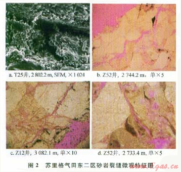 鑄體薄片、掃描電鏡中常見成巖裂縫,以溶蝕縫最常見(圖2),收縮縫和貼粒縫最少。研究區(qū)約30%的砂巖粒間孔具有溶蝕現(xiàn)象,在鏡下所見微孔隙直徑主要范圍在介于5~50μm,延伸范圍常超出視域,溶蝕裂縫形態(tài)多呈不規(guī)則彎曲狀,微裂縫可見分岔,溶蝕裂縫常溝通孔隙,改善儲層孔隙結(jié)構(gòu)。