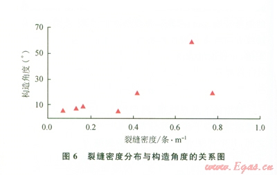 4)裂縫的發(fā)育程度與構(gòu)造角度存在一定相關(guān)性,構(gòu)造角度越大,裂縫密度越大,裂縫越發(fā)育。