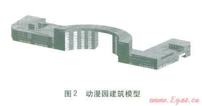 能耗模擬軟件Energyplus在基本使用特性、計(jì)算能力和設(shè)備兼容性等方面較為突出[13-16],但需要友好的用戶圖形界面與之配合[17],Designbuilder是專門針對(duì)Energyplus開發(fā)的用戶圖形界面軟件。利用Designbuilder軟件建立動(dòng)漫園建筑模型,見圖2。相關(guān)能耗模擬參數(shù)為:①圍護(hù)結(jié)構(gòu)。外墻傳熱系數(shù)為0.52 W/(m2·K);屋面、樓板傳熱系數(shù)為0.44W/(m2·K);外窗傳熱系數(shù)為2.70 W/(m2·K),自身遮陽(yáng)系數(shù)為0.70,可見光透射比(4個(gè)朝向相同)為0.40,建筑各朝向(含透明幕墻)窗墻比均小于0.70。②散熱量及人員密度。大廳:照明散熱量為13 W/m2,設(shè)備散熱量為13 W/m2,人員密度為0.3人/m2。走廊:照明散熱量為5 W/m2,人員密度為0.025人/m2。餐廳:照明散熱量為9 W/m2,設(shè)備散熱量為5 W/m2,人員密度為0.4人/m2。辦公室:照明散熱量為9 W/m2,設(shè)備散熱量為30 W/m2,人員密度為0.25人/m2。競(jìng)技廳:照明散熱量為18 W/m2,設(shè)備散熱量為30 W/m2,人員密度為0.6人/m2。③新風(fēng)量:大廳、餐廳、競(jìng)技廳大于等于