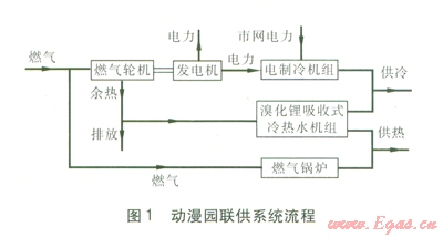 動(dòng)漫園聯(lián)供系統(tǒng)流程見圖1。聯(lián)供系統(tǒng)由燃?xì)廨啓C(jī)發(fā)電機(jī)組(以下簡(jiǎn)稱發(fā)電機(jī)組)、溴化鋰吸收式冷熱水機(jī)組(以下簡(jiǎn)稱吸收式機(jī)組)、電制冷機(jī)組(離心式冷水機(jī)組)和燃?xì)忮仩t組成。發(fā)電機(jī)組發(fā)電和市政電網(wǎng)電用于滿足建筑的電負(fù)荷。電制冷機(jī)組所需電量?jī)?yōu)先采用發(fā)電機(jī)組發(fā)電,不足部分由市政電網(wǎng)補(bǔ)充。發(fā)電機(jī)組發(fā)電量作為自用,不上網(wǎng)銷售,發(fā)電余熱驅(qū)動(dòng)吸收式機(jī)組向建筑供熱或供冷。當(dāng)供熱量不足時(shí)由燃?xì)忮仩t補(bǔ)充,制冷量不足時(shí)由電制冷機(jī)組補(bǔ)充。