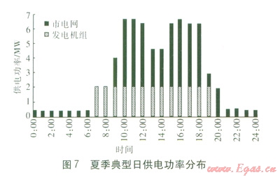 在動(dòng)漫園實(shí)行峰谷電價(jià)的基礎(chǔ)上,冬夏季典型日聯(lián)供系統(tǒng)的供熱量、供冷量、供電功率的分布見圖4~7。由于在優(yōu)化模型中考慮了設(shè)備負(fù)荷率等實(shí)際因素的影響,因此對(duì)于根據(jù)優(yōu)化結(jié)果進(jìn)行配置的方案,圖4~7即可反映全年典型目的各個(gè)設(shè)備啟停狀態(tài),即優(yōu)化配置方案下的運(yùn)行策略。