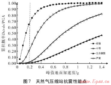 圖7所示脆弱性曲線,反映了該天然氣壓縮站四種破壞程度的概率值。由圖中任一條脆弱性曲線趨勢可以看出,隨著地震所導(dǎo)致的地面峰值加速度的加大,特定破壞程度的概率也在不斷的提高。并且當(dāng)?shù)孛娣逯导铀俣戎迪嗤瑫r,壓縮站較低破壞程度的概率相對較高。最后,根據(jù)圖6中確定的性能點,可以得到當(dāng)峰值地面加速度為0.2g時,對應(yīng)的輕微破壞的概率約為0.65,而對應(yīng)中等破壞的概率為0.2。至此,完成了在特定地震強度下該天然氣壓縮的脆弱性評估工作。