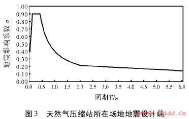根據(jù)規(guī)范要求,采用如圖1形式的設(shè)計反應(yīng)譜。反應(yīng)譜相關(guān)參數(shù)設(shè)置如下:水平地震影響系數(shù)最大值為0.9,特征周期值為0.4s,建筑結(jié)構(gòu)的阻尼比取0.05,地震影響系數(shù)曲線的阻尼調(diào)整系數(shù)為1.0,曲線下降段自特征周期至5倍特征周期區(qū)段的衰減指數(shù)取0.9。直線下降段自5倍特征周期至6s區(qū)段下降斜率調(diào)整系數(shù)取0.02。通過計算,得到天然氣壓縮站所在場地地震設(shè)計譜如圖3所示。以該反應(yīng)譜作為該天然氣壓縮站所在場地的地震潛在危險。