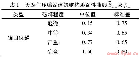 由于我國缺少燃?xì)鈮嚎s站脆弱性曲線相關(guān)數(shù)據(jù),這里依據(jù)HAZUS中建議采用相關(guān)參數(shù),如表1所示,擬合出的天然氣壓縮站的脆弱性曲線,如圖7所示。