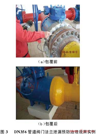 泄漏,然后按照上述施工流程對法蘭進行碳纖維復合材料堵漏加固處理,待復合材料養(yǎng)護固化后,進行耐壓密封試驗。結果表明:采用碳纖維復合材料進行管道法蘭滲漏治理,管道系統(tǒng)連接法蘭在 10 MPa 介質壓力下,露天環(huán)境下穩(wěn)壓 14 d,堵漏區(qū)域無任何泄漏??梢姡撎准夹g方案對存在泄漏隱患的管道法蘭泄漏治理非常有效。由于該套技術方案具有作業(yè)不動火、操作安全、成本費用低等特點,2008-2011年,采用復合材料修復技術對西氣東輸全線 220 多個線路閥室旁通管道 DN356 閥門連接法蘭及各站場與干線連接的DN50 和 DN80 管道法蘭泄漏隱患進行治理(圖 3),在確保管道安全平穩(wěn)運行的同時,節(jié)約了大量維修費用。復合材料修復對法蘭結構具有一定的加固作用,可提高法蘭的抗軸向拉伸、彎曲能力,防止密封面泄漏情況進一步惡化。但是,對于已經(jīng)出現(xiàn)明顯泄漏的高壓(7 MPa 以上)法蘭,治理效果不佳。