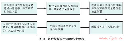 基本原理:對連接法蘭面間隙填充高強度堵漏密封材料,再用由高強度纖維與環(huán)氧粘結劑組成的復合材料對法蘭連接部位進行整體外包覆,待復合材料結構固化后,形成一個高強度殼體結構,實現(xiàn)整體加固,達到預防法蘭泄漏的目的(圖 2)。