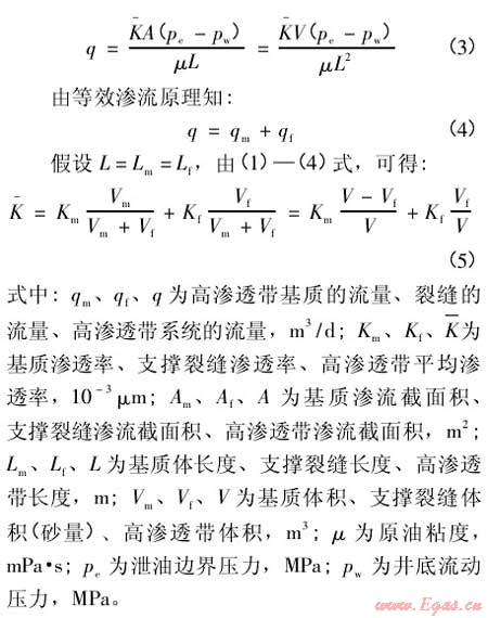 式(5)建立了單簇高滲透帶系統(tǒng)滲透率、基質(zhì)滲透率、支撐裂縫滲透率與高滲透帶體積、支撐裂縫體積(砂量)之間的關(guān)系。