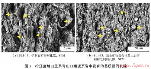 摘 要:為了查明泥頁巖系統(tǒng)微觀孔隙發(fā)育特征及其油氣地質(zhì)意義,利用掃描電鏡及場發(fā)射掃描電鏡二次電子成像技術對松遼盆地白堊系青山口組一段泥頁巖中的微觀孔隙進行了系統(tǒng)觀察。該套泥頁巖中主要發(fā)育了5種類型孔隙,即基質(zhì)晶間孔、有機質(zhì)孔、溶蝕孔、粒間孔、晶內(nèi)孔;此外,還發(fā)育大量微米—亞微米級(納米級)微裂縫,包括溶蝕縫、充填縫及層間縫3類。微孔隙和微裂縫構成復雜微裂縫網(wǎng)絡-孔隙系統(tǒng),為烴源巖生成的油氣向外排驅(qū)提供了有效通道,同時也為殘留在頁巖中的油氣提供了充分的儲集空間,對于油氣的初次運移以及頁巖油氣等非常規(guī)資源的儲集具有重要意義。