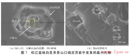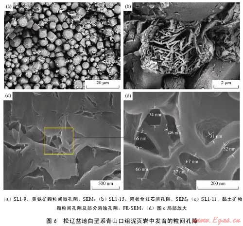 利用掃描電鏡和場發(fā)射掃描電鏡二次電子成像技術對松遼盆地主要生油層白堊系青山口組泥頁巖中發(fā)育的孔隙和微裂縫進行了系統(tǒng)的成像觀察,發(fā)現(xiàn)該套頁巖中主要發(fā)育了5種類型孔隙即基質(zhì)晶間孔、有機質(zhì)孔、溶蝕孔、粒間孔、晶內(nèi)孔及微米—亞微米級(納米級)微裂縫,微裂縫包括充填縫、溶蝕縫及層間縫。各種類型孔隙與微裂縫伴生發(fā)育,并可能彼此連通。這種復雜微裂縫網(wǎng)絡-孔隙系統(tǒng)的存在為油氣從烴源巖向外排驅(qū)提供了有效通道,同時也為滯留在泥頁巖中的部分油氣提供了有效的儲集空間。該套地層中各類型孔隙尺寸為納米—微米級,可能主要受頁巖基質(zhì)的微觀孔隙結構、礦物組成、有機質(zhì)類型以及有機質(zhì)的熱演化程度等因素的影響。