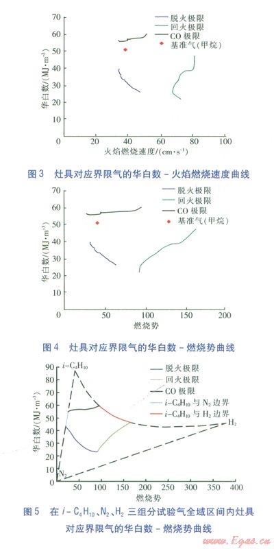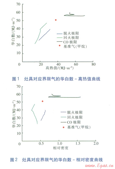 為了確定表征燃具適應(yīng)性的燃燒特性指數(shù),課題組建立了試驗(yàn)裝置,選擇大氣式燃具(主要為家用燃?xì)庠罹?,包括嵌入式灶、臺式灶),進(jìn)行了燃燒工況測試。分別測量灶具在脫火、回火、C0超標(biāo)時(shí)的燃?xì)饨M成,由此計(jì)算各極限情況下的燃燒特性指數(shù)。并根據(jù)華白數(shù)、高熱值、相對密度、火焰燃燒速度、燃燒勢等關(guān)鍵指數(shù),繪制試驗(yàn)數(shù)據(jù)圖形(直角坐標(biāo)系),確定表征燃具適應(yīng)性的燃燒特性指數(shù)。