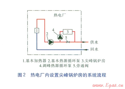 熱電廠內(nèi)設(shè)置尖峰鍋爐房(系統(tǒng)流程見圖2)。由圖2可知,熱水經(jīng)過基本加熱器加熱后進(jìn)入熱網(wǎng)熱負(fù)荷主干線。當(dāng)供暖期處于初末寒期時(shí),旁通閥開啟,尖峰鍋爐房不投入運(yùn)行。當(dāng)進(jìn)入嚴(yán)寒期時(shí),旁通閥關(guān)閉,尖峰鍋爐房投入運(yùn)行,基本加熱器出水經(jīng)尖峰鍋爐房加熱至設(shè)計(jì)溫度,進(jìn)入熱網(wǎng)主干線。對于這種設(shè)置方式,峰荷熱源的投資、運(yùn)營方均為熱電廠。