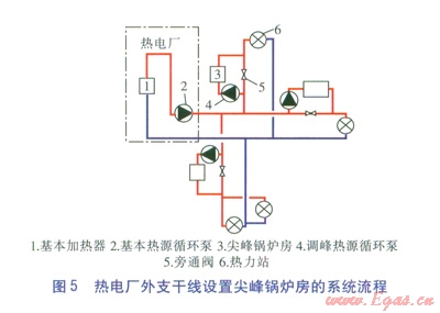 熱電廠外支干線設(shè)置尖峰鍋爐房(系統(tǒng)流程見圖5)。由圖5可知,與設(shè)置在熱電廠外主干線的峰荷熱源不同之處為尖峰鍋爐房設(shè)置在熱網(wǎng)的支干線上,尖峰鍋爐房負(fù)責(zé)某個(gè)分支的尖峰熱負(fù)荷。尖峰鍋爐房可以新建,也可以利用原有小區(qū)的供熱鍋爐房。對于這種設(shè)置方式,峰荷熱源的投資、運(yùn)營方均為供熱公司。