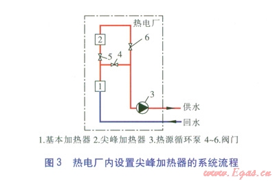 熱電廠內(nèi)設(shè)置尖峰加熱器(系統(tǒng)流程見圖3)。由圖3可知,當(dāng)供暖期處于初末寒期時(shí),閥門4開啟,閥門5、6關(guān)閉,尖峰加熱器不投入運(yùn)行。當(dāng)進(jìn)入嚴(yán)寒期時(shí),閥門4關(guān)閉,閥門5、6開啟,尖峰加熱器投入運(yùn)行。雖然采用尖峰加熱器作為峰荷熱源的造價(jià)較低且易于實(shí)現(xiàn),但尖峰加熱器需較高參數(shù)的蒸汽,對發(fā)電量有一定影響。對于這種設(shè)置方式,峰荷熱源的投資、運(yùn)營方均為熱電廠。