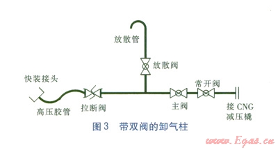 考慮到卸氣柱是高壓管道系統(tǒng),其主閥在使用過程中發(fā)生內(nèi)漏時(shí),就要及時(shí)更換。由于一般都是2套或3套卸氣柱通過高壓管道匯合在一起后連接到CNG減壓橇的進(jìn)口,如果某一卸氣柱的主閥需要更換時(shí),就要停止所有卸氣柱工作并放空高壓管道中的CNG。如果不允許CNG減壓橇停氣,就無法更換閥門。要解決這一問題,可以在卸氣柱主閥后面增加一個(gè)常開閥(此時(shí)主閥成雙閥結(jié)構(gòu))。帶雙閥的卸氣柱見圖3。