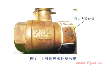 Ⅰ號銅球閥開裂形貌見圖l,閥體沿軸向方向開裂,裂口長度約l