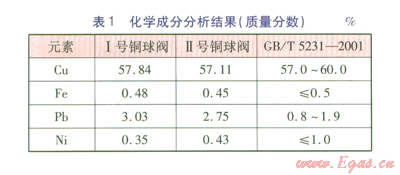 分別對Ⅰ號、Ⅱ號銅球閥閥體的化學成分進行檢測分析,分析結果見表1。