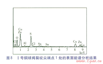 對Ⅱ號銅球閥裂口尖端處的灰色物質試樣進行掃描電子顯微鏡觀察,結果表明:裂紋表面可見明顯灰色覆蓋物。能譜分析結果表明主要成分為Cu、Zn、S、O和少量Cr、Mn等,Ⅱ號銅球閥裂紋尖端點l處的電子顯微鏡觀察結果和表面能譜分析結果見圖9、10。