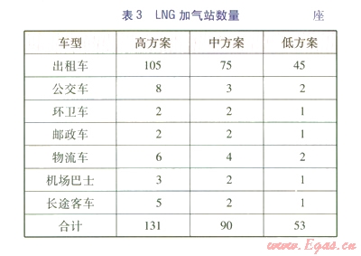 預(yù)測(cè)LNG長(zhǎng)途客車的發(fā)展為高方案100輛、中方案60輛、低方案30輛。按日加氣l
