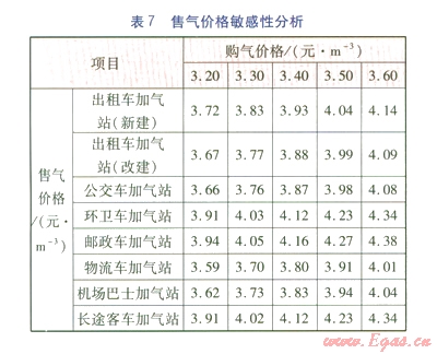 目標(biāo)收益率設(shè)定為項(xiàng)目資本金內(nèi)部收益率為12%,測(cè)算各類加氣站的售氣價(jià)格,見表6。由表6可知,物流車、機(jī)場(chǎng)巴士、公交車、出租車等加氣站的售氣價(jià)格較低,更有市場(chǎng)吸引力。