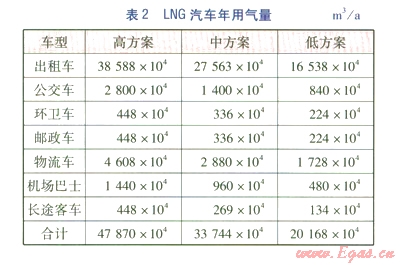 根據(jù)各類LNG車輛潛在用戶的特點(diǎn),對(duì)各類LNG汽車發(fā)展數(shù)量及年用氣量進(jìn)行了高、中、低3種方案的預(yù)測(cè),分別見表1、2。