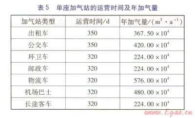 按30%資本金考慮,其余為國(guó)內(nèi)商業(yè)銀行貸款,貸款利率為7.05%。單座加氣站的運(yùn)營(yíng)時(shí)間及年加氣量見表5。