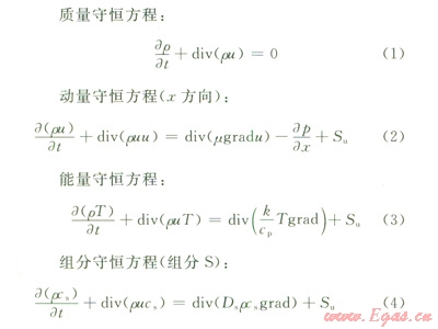 CFD可以看作是在流動(dòng)基本方程(質(zhì)量守恒方程、動(dòng)量守恒方程、能量守恒方程)控制下對(duì)流動(dòng)數(shù)值的模擬。通過(guò)這種數(shù)值模擬,可以得到極其復(fù)雜問(wèn)題的流場(chǎng)內(nèi)各個(gè)位置上基本物理量(如速度、壓力、溫度、濃度等)的分布,以及這些物理量隨時(shí)間的變化情況。由于含硫天然氣是混合物質(zhì),因此,控制方程還應(yīng)包括組分守恒方程。4個(gè)方程的表達(dá)式如下。