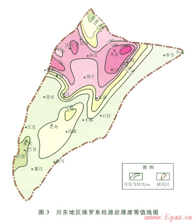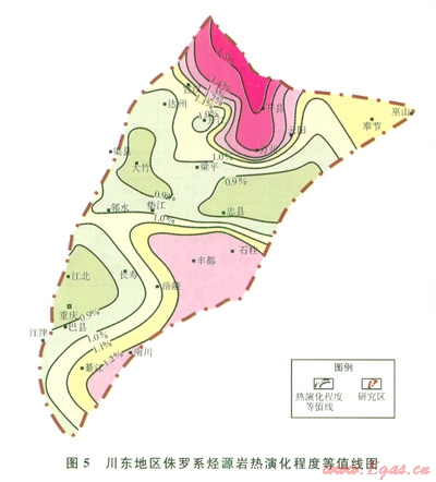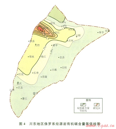 從圖4所示烴源巖有機碳分布圖來看,川東大部分地區(qū)侏羅系烴源巖的總有機碳含量(TOC)一般都超過l%,屬于好的生油巖。特別是位于半深湖相區(qū)的達州一帶TOC超過2%。需要說明的是,由于目前缺乏侏羅系巖心資料,圖4主要根據(jù)野外露頭樣品的分析數(shù)據(jù)而繪制,而露頭樣品的TOC由于受長期風化作用的影響而往往偏低。該地區(qū)侏羅系烴源巖的TOC實際上應該更高。