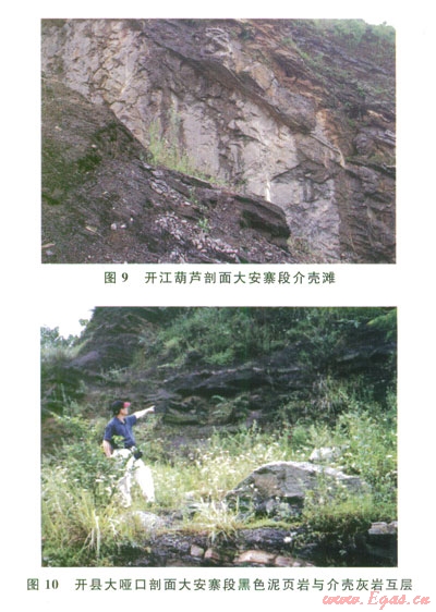 從川東地區(qū)有侏羅系錄井資料的鉆井厚度統(tǒng)計資料來看,大安寨段介殼灰?guī)r和新田溝組砂巖不僅在區(qū)內分布廣泛,而且累計厚度也較大(圖7、8)。由于過去侏羅系在川東不是油氣勘探目的層段,許多鉆井中缺乏侏羅系巖性錄井資料,由此對廣泛分布于川中地區(qū)的大一層和大三層生物介殼灘是否也發(fā)育于川東地區(qū)表示過懷疑。然而,筆者等人在2004年開展大巴山前陸盆地烴源巖專項研究時[16],曾對川東地區(qū)侏羅系進行過野外剖面踏勘,發(fā)現(xiàn)大安寨段生物介殼灘在川東地區(qū)也是普遍存在的(圖9、10)。此外,在萬州-梁平忠縣向斜所鉆探的拔向1、云安18、興隆101等多口井已揭示,大一層介殼灰?guī)r厚度可達