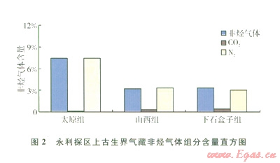 本區(qū)上古生界天然氣中含量最高的非烴氣體為氮氣,含量一般在3%以上。太原組天然氣組分中氮氣含量為7.36%;山西組氣藏中氮氣含量有所降低,分布范圍為2.15%~3.41%,均值為2.88%;下石盒子組氮氣含量與下部的山西組氣藏相近,均值為3.Ol%(表1、圖2)。這一分布特征與區(qū)塊北部的天環(huán)北段和橫山堡氣田的天然氣中氮氣含量近似,要高于榆林、神木、米脂等氣田。由此可見,構(gòu)造活動較為強烈的西緣逆沖帶為整個鄂爾多斯盆地氮氣含量相對較高的區(qū)域。這一現(xiàn)象說明天然氣中氮氣含量的增加主要與氣藏的保存條件有關(guān),但也可能有深大斷裂造就的深源氮氣的貢獻(xiàn)。