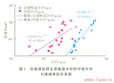 喉道大小及分布是控制儲層滲流能力的關(guān)鍵。定義對滲透率累積貢獻達95%以前喉道半徑的加權(quán)平均值為主流喉道半徑。須家河組不同儲層巖樣主流喉道半徑和中值半徑與滲透率關(guān)系表明(圖1),主流喉道半徑隨滲透率的增加而增加,二者之間存在非常好的正相關(guān)關(guān)系;但是中值半徑與滲透率之間的相關(guān)性較差。這說明主流喉道半徑不僅能表征儲層基質(zhì)的滲透能力,而且能夠反映儲層微觀孔隙結(jié)構(gòu)特征。