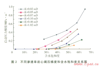 低滲透砂巖含水氣藏巖樣滲流實驗表明,當含水飽和度較高時,氣體滲流出現(xiàn)非達西流現(xiàn)象,存在閾壓梯度[8]。閾壓梯度與巖心滲透率及含水飽和度相關(guān)(圖2),巖心滲透率越低,含水飽和度越高,閾壓梯度越大。閾壓梯度可作為衡量儲層流動性強弱的指標,也是影響儲量動用程度的重要參數(shù),因此,將閾壓梯度作為低滲含水儲層評價參數(shù)是必要的。