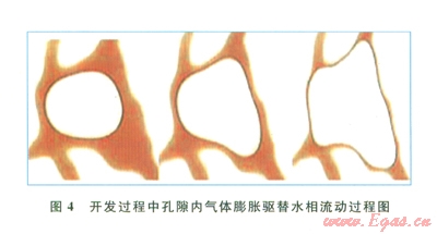 氣藏開發(fā)過程中,隨著儲層壓力逐步下降,壓力降傳導(dǎo)到孔隙內(nèi)的氣體時,氣體體積迅速膨脹,對孔隙表面水相進(jìn)行擠壓,并對微細(xì)孔喉處的水相產(chǎn)生推動力,這種推動力只要大于某一微細(xì)孔喉處的毛細(xì)管力束縛,則這部分微細(xì)孔喉處及其控制的孔隙內(nèi)的殘余水就會被推動,從而運移產(chǎn)出成為可動水(圖4)。另一方面,開發(fā)過程遠(yuǎn)遠(yuǎn)快于成藏過程,因而開發(fā)過程中驅(qū)替壓力梯度大于成藏過程中的驅(qū)替壓力梯度,故成藏過程中部分末被驅(qū)出的水相可以在開發(fā)過程被驅(qū)替出,成為可動水。對于須家河組氣藏而言,由于微細(xì)孔喉發(fā)育,殘余水飽和度較高,衰竭式開發(fā)過程中壓力梯度大,因而可動水產(chǎn)出量較大,嚴(yán)重影響氣藏產(chǎn)能。