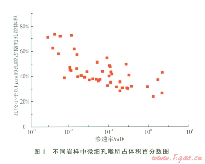 巖樣壓汞測試結(jié)果表明,須家河組低滲儲層孔喉細(xì)小,微孔喉發(fā)育。儲層滲透率越低,小于0.1 μm的微喉道控制的孔隙體積比例越高(圖1)。對于覆壓滲透率為0.1 mD左有的儲層,由小于0.1 μm的喉道控制的孔隙體積在30%以上,對滲流能力起主要貢獻(xiàn)作用的是0.5~1μm之間的喉道。覆壓滲透率0.01mD左右的儲層,由小于0.1μm的喉道控制的孔隙體積在45%~75%之間,對滲流能力起主要貢獻(xiàn)作用的是0.1~0.5μm之間的喉道。