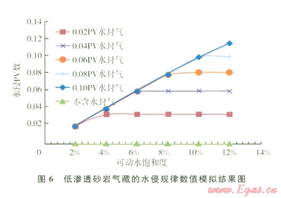 為了進(jìn)一步研究儲層產(chǎn)水的宏觀機(jī)理,開展了兩種氣水狀態(tài)下的物理模擬實驗和數(shù)值計算。一種是氣水分異明顯的儲層,一種是氣水互封狀態(tài)下的儲層再,對比分析水封氣狀態(tài)及氣、水能量對儲層產(chǎn)水的影響規(guī)律。結(jié)果表明,對于氣水分異明顯的低滲儲層,由于水相彈性膨脹能力小,且儲層滲透率低,儲層產(chǎn)水量很小,而且水體倍數(shù)對其影響也很小,對于氣體產(chǎn)能影響不大,可以忽略不計。對于氣水互封的儲層,采氣過程中巖心的水侵量達(dá)到了0.2 PV,會嚴(yán)重影響氣體產(chǎn)能,可見氣水存在關(guān)系對于氣井產(chǎn)水有重要影響。圖6是不同水封氣量下氣井開發(fā)過程中的水侵動態(tài)數(shù)值計算結(jié)果,發(fā)現(xiàn)水封氣能量越高,儲層越容易產(chǎn)水;隨可動水飽和度增加(對于束縛水飽和度一定的儲層,即原始含水飽和度增加),氣井開發(fā)過程中的水侵量顯著增加,南不含水封氣到0.1 PV水封氣,對應(yīng)的水侵量由0增加到近0.12 PV,嚴(yán)重影響氣井產(chǎn)能。由此可見,低滲儲層產(chǎn)水量主要受到兩方面的宏觀因素控制:一是水封氣能量大小,二是可動水飽和度高低。