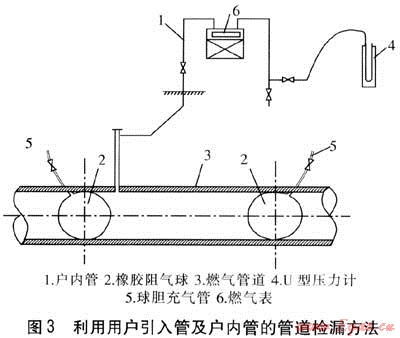 如果兩球之間的管段上連接有用戶,則可利用用戶引入管進行管道檢漏(見圖3),充氣和測壓可充分利用用戶引入管及戶內(nèi)管。