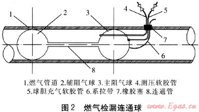 這種燃?xì)鈾z漏連通球工具,利用兩只相互連通的橡膠球,在管道內(nèi)制造一個局部密閉空間,用來檢漏。這是一組用橡膠管連接起來的可充氣的連體橡膠球膽,球膽充氣軟膠管是為主阻氣球、輔阻氣球充、泄氣用的專用管;測壓軟膠管穿過主阻氣球通至兩球間,它與主阻氣球密封連接,但不連通,不影響連通球本身的整體密閉性,它的作用一是為管道內(nèi)新制造的這個局部密閉空間充、泄氣,二是充氣后測壓;系拉帶是檢漏完畢后為取出連通球而專設(shè);橡皮塞起密封作用,與軟管和系拉帶之間用橡皮泥密封。